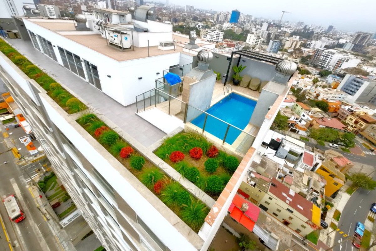 El edificio cuenta con seguridad las 24 horas del día, personal de limpieza y áreas comunes modernas y elegantes, como una recepción impresionante, un lobby que te dará la bienvenida a tu hogar, un salón de juegos para niños, una zona de parrillas para tus reuniones familiares, una sala bar para tus eventos sociales, un gimnasio para mantenerte en forma, una piscina para relajarte, una terraza para disfrutar del aire libre, y una estación de bicicletas para los amantes de la movilidad sostenible. Además, hay 15 estacionamientos para tus visitas y dos ascensores para mayor comodidad. El costo de mantenimiento, que incluye el agua, es de solo S/ 450 soles aproximadamente.