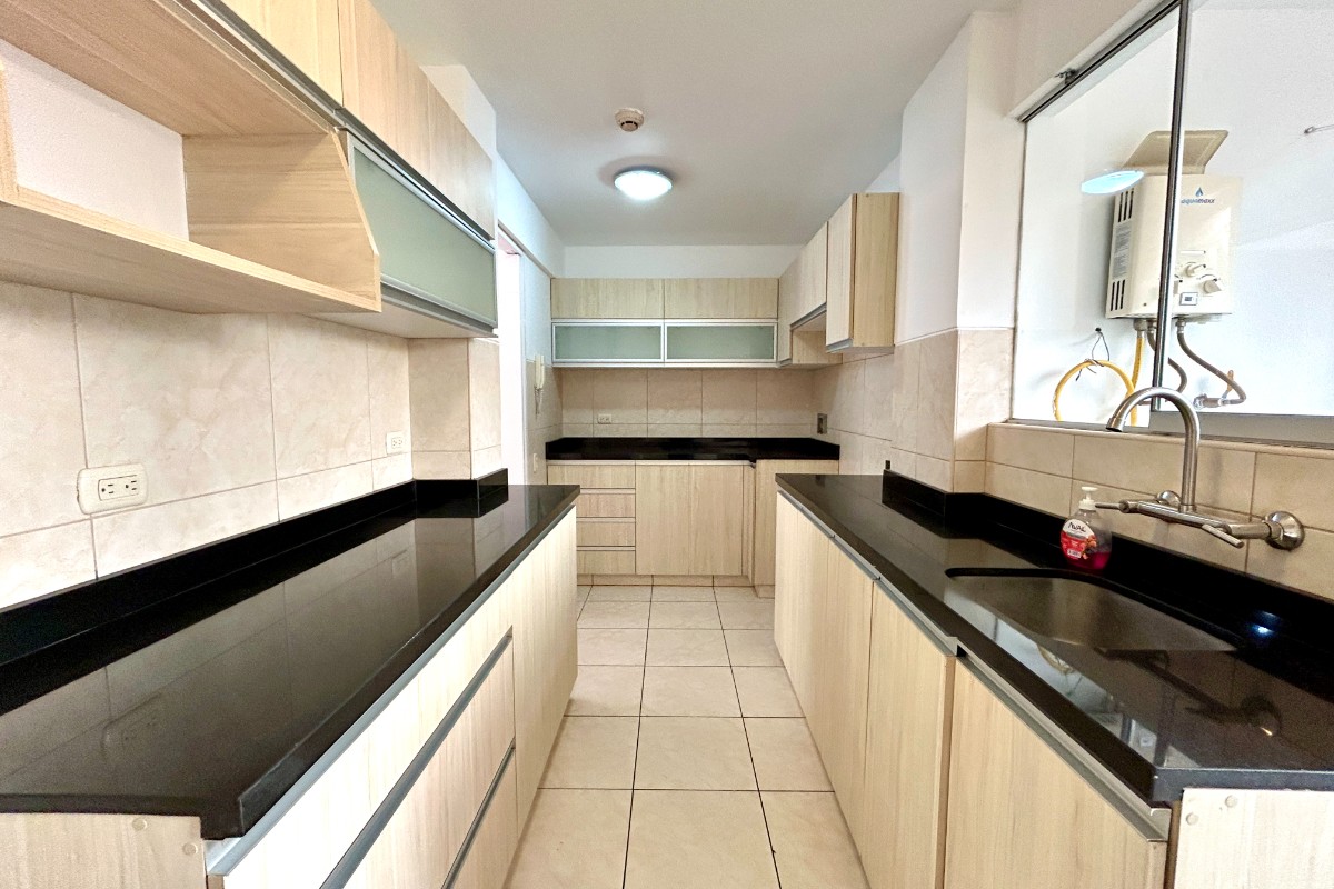 -Cocina con instalación de gas calidda, muebles altos y bajos.